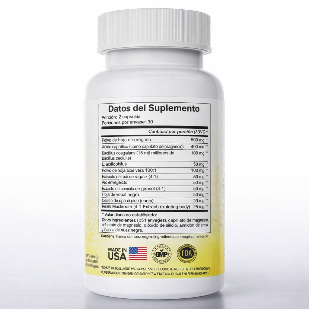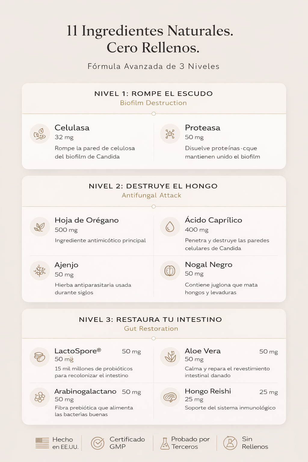 "Nuestra fórmula fue desarrollada siguiendo los mismos principios que los especialistas en salud digestiva utilizan con sus pacientes: eliminar el hongo, romper su protección, y restaurar el intestino. Fabricada en instalaciones registradas por la FDA en Estados Unidos, con certificación GMP y verificada por laboratorios independientes. No es solo un suplemento — es el protocolo completo en una cápsula